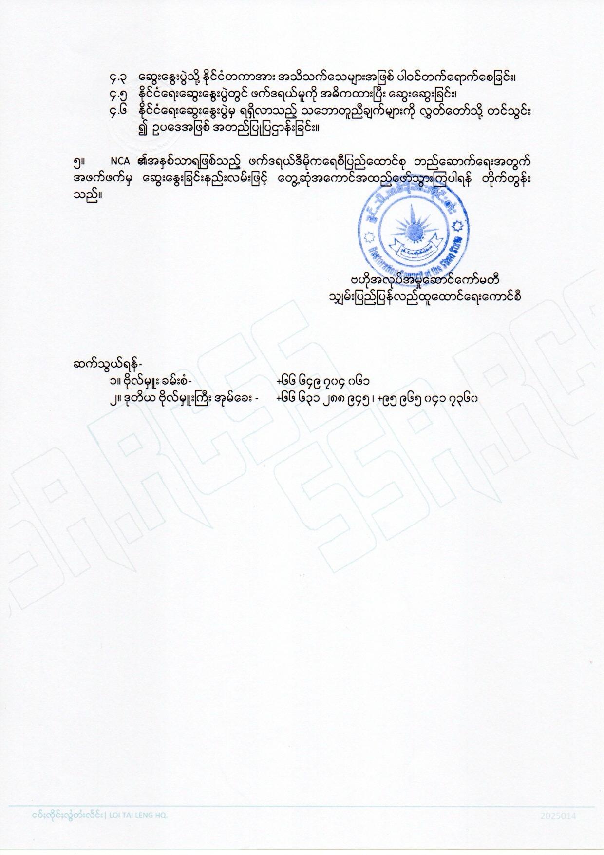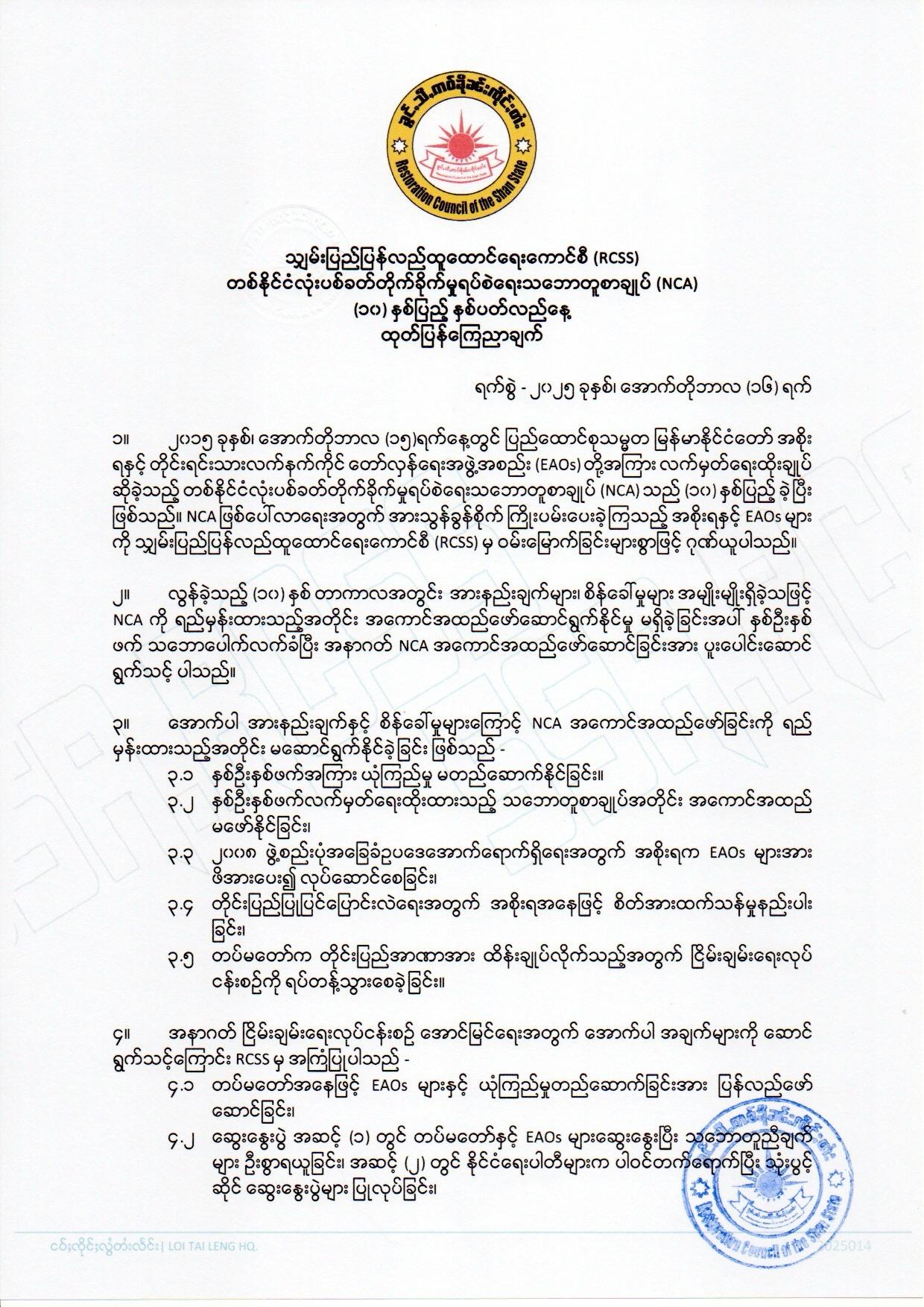 NCA လက်မှတ်ရေးထိုးထားတဲ့အဖွဲ့တစ်ခုဖြစ်တဲ့ ရှမ်းပြည်ပြန်လည်ထူထောင်ရေးကောင်စီ/ရှမ်းပြည်တပ်မတော် RCSS/SSA က NCA ၁၀ နှစ်ပြည့် ထုတ်ပြန်ချက်တစ်စောင်ကို ထုတ်ပြန်ခဲ့တာပါ။
